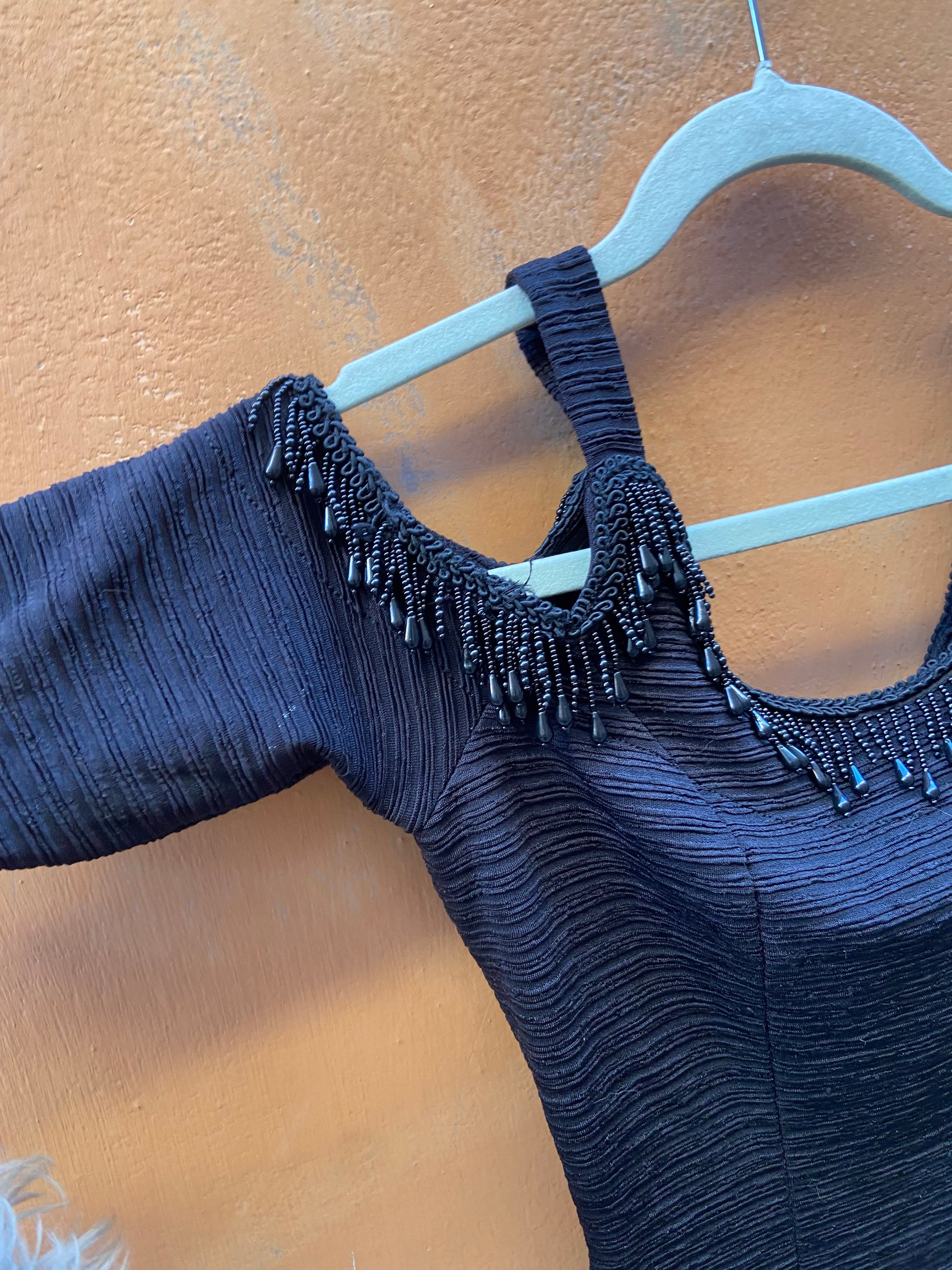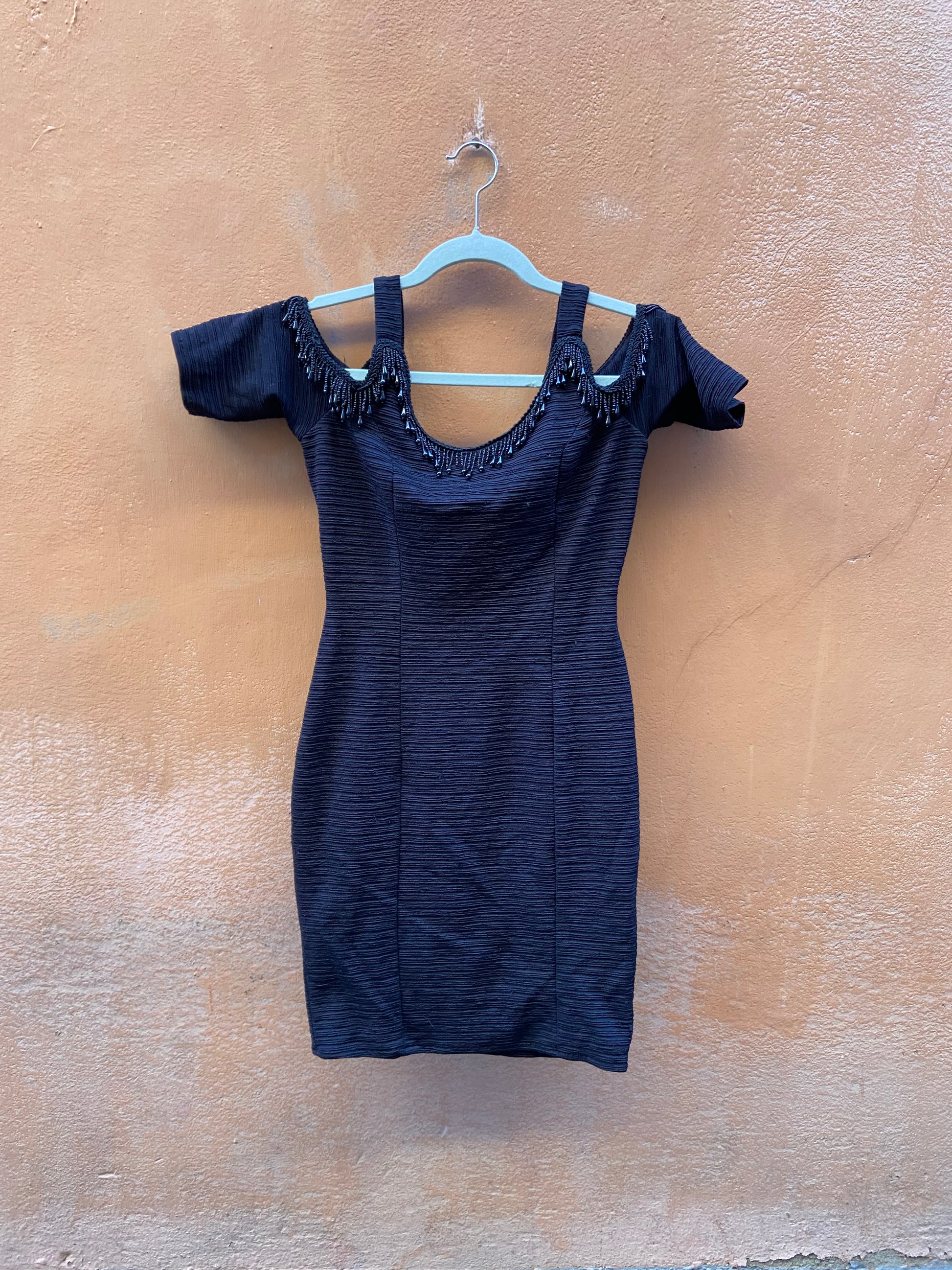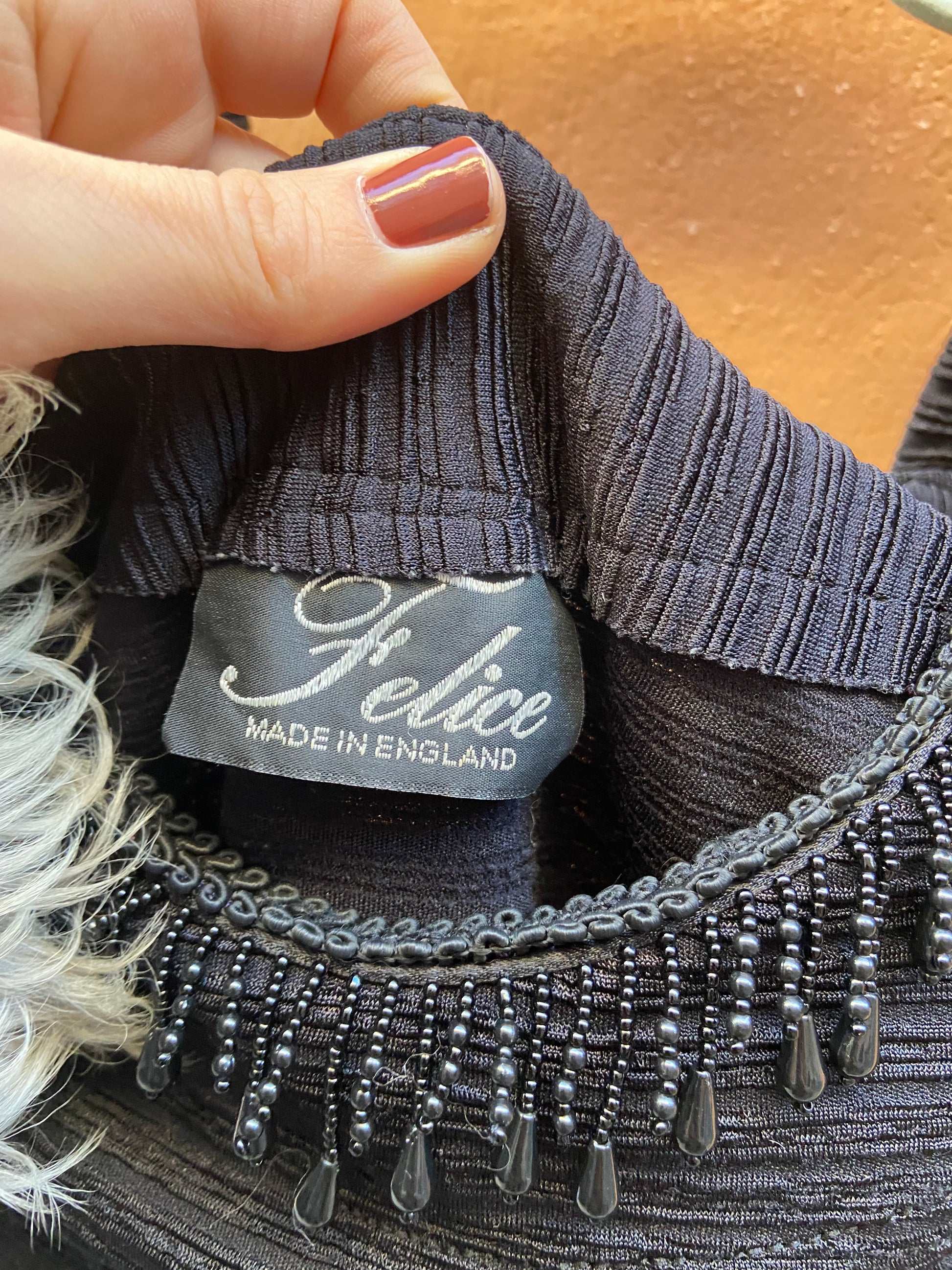 Abito vintage anni 80 made in England stretch non ci sono indicazioni in Italia. Lo consiglio per una taglia S è completamente elastico. Le condizioni sono ottima. Ci sono le perline sulle manica e sullo scollo è davvero carino e perfetto per le feste di capodanno.