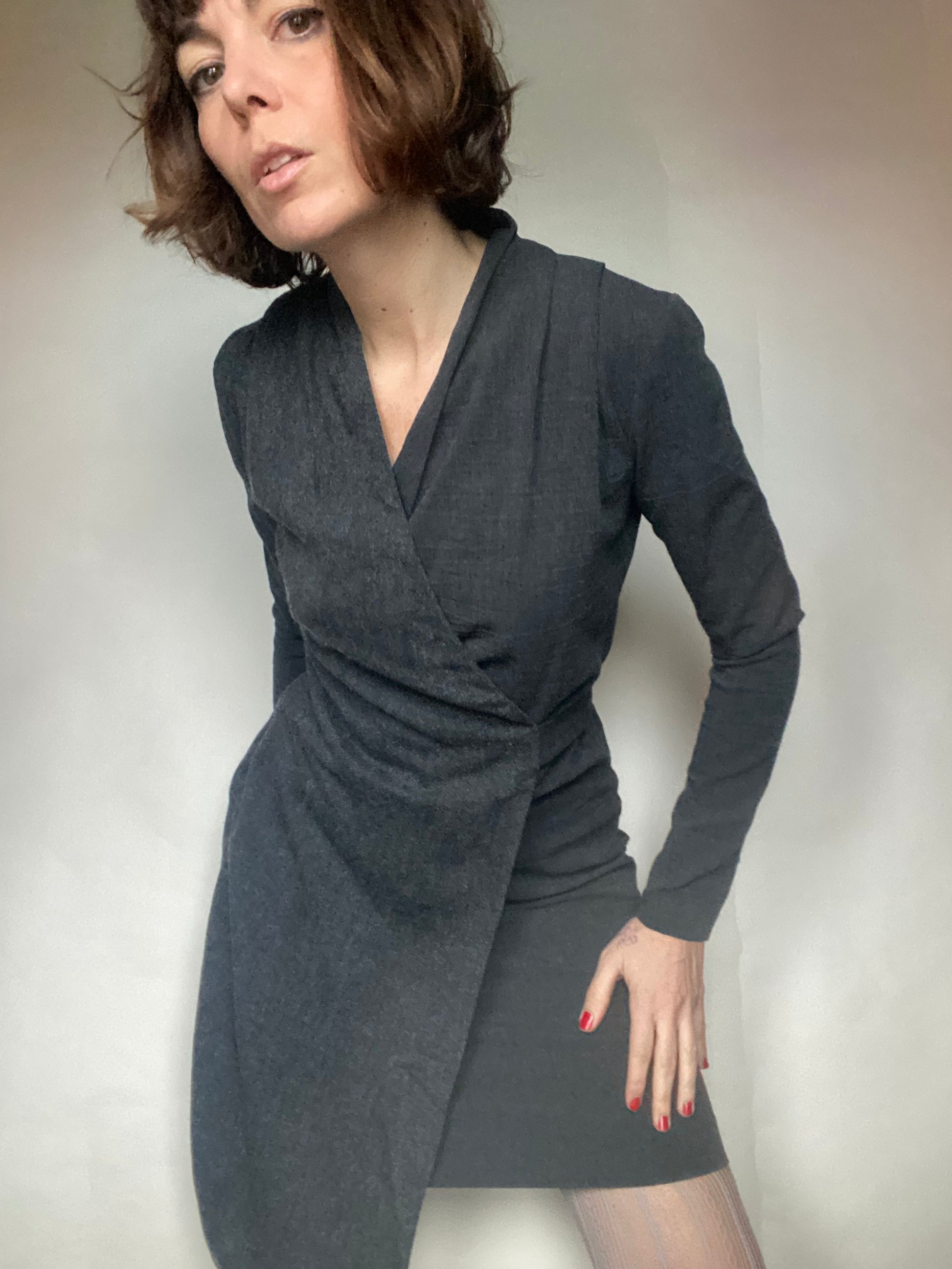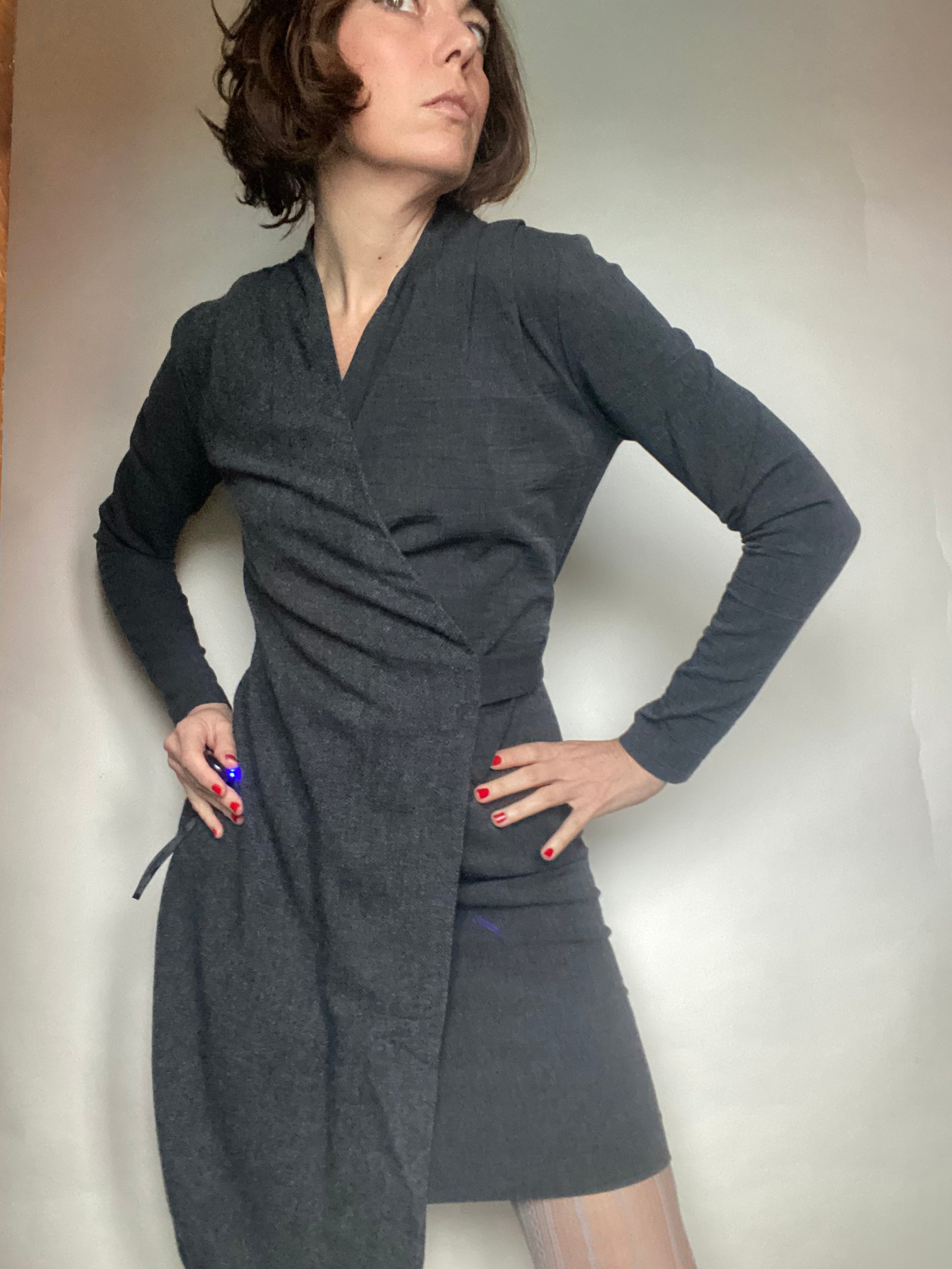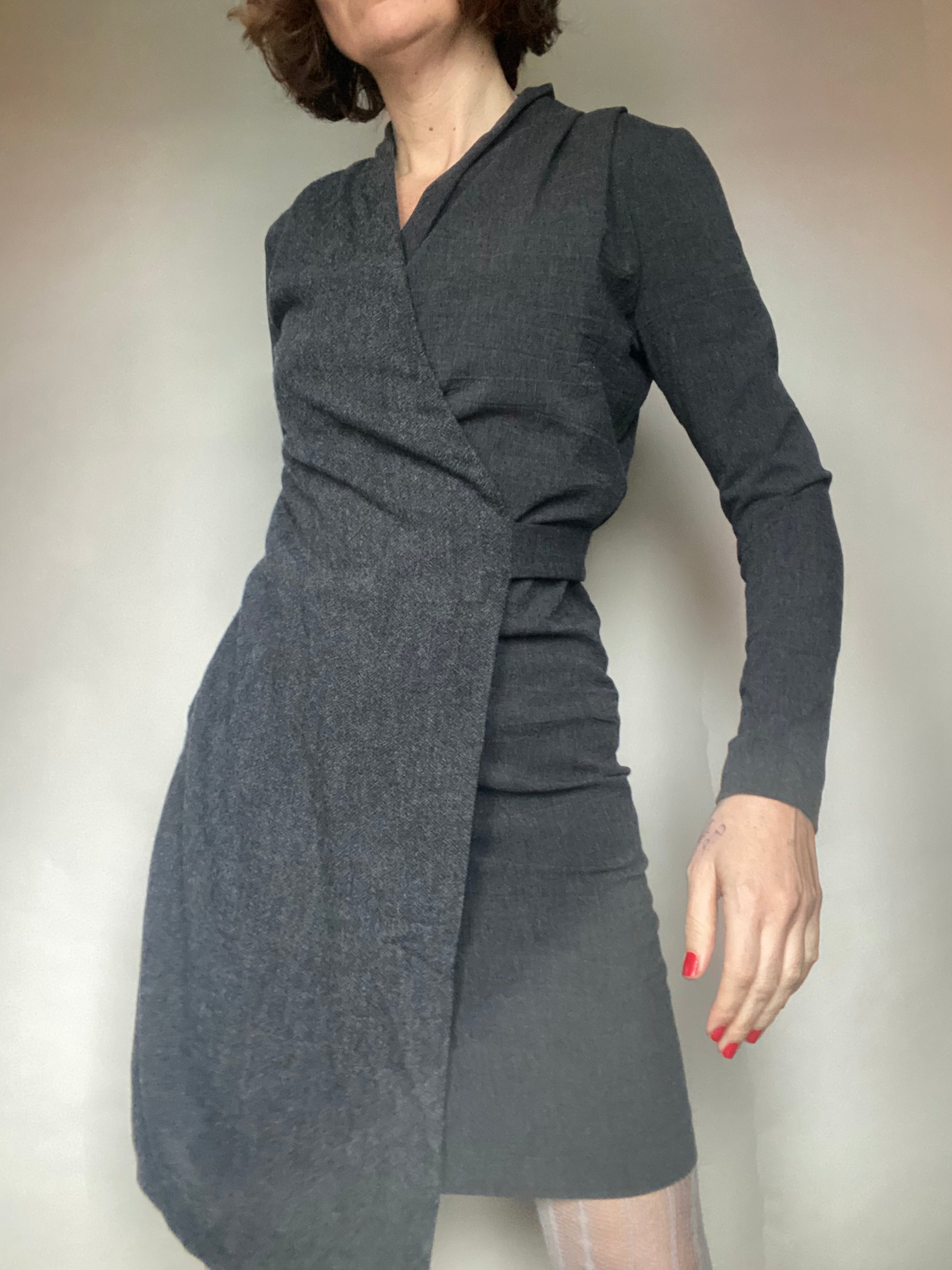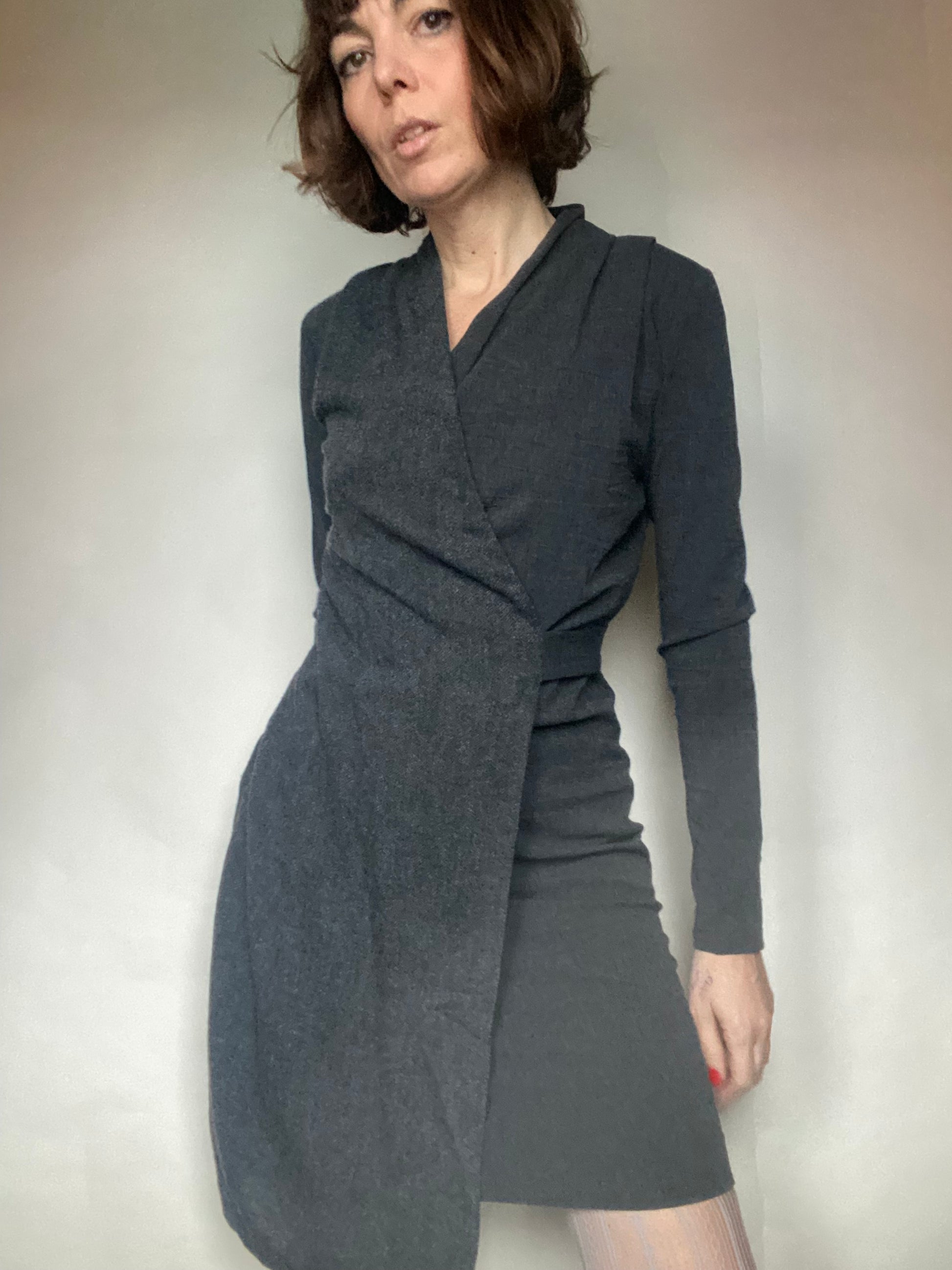 Abito invernale classy con una parte sotto stretch e una parte sopra wrap, cerniera laterale etichette tagliate veste una 40 ita