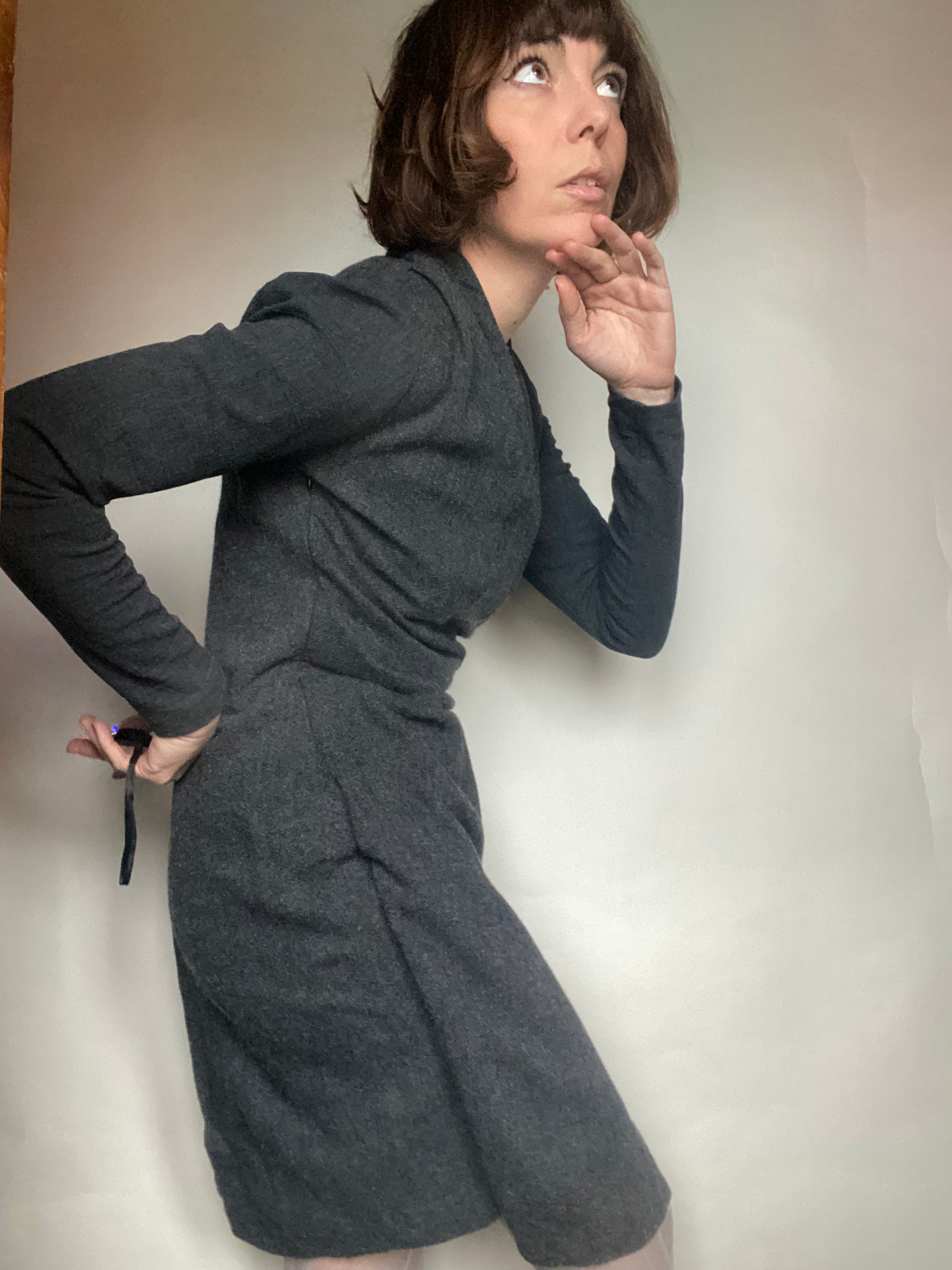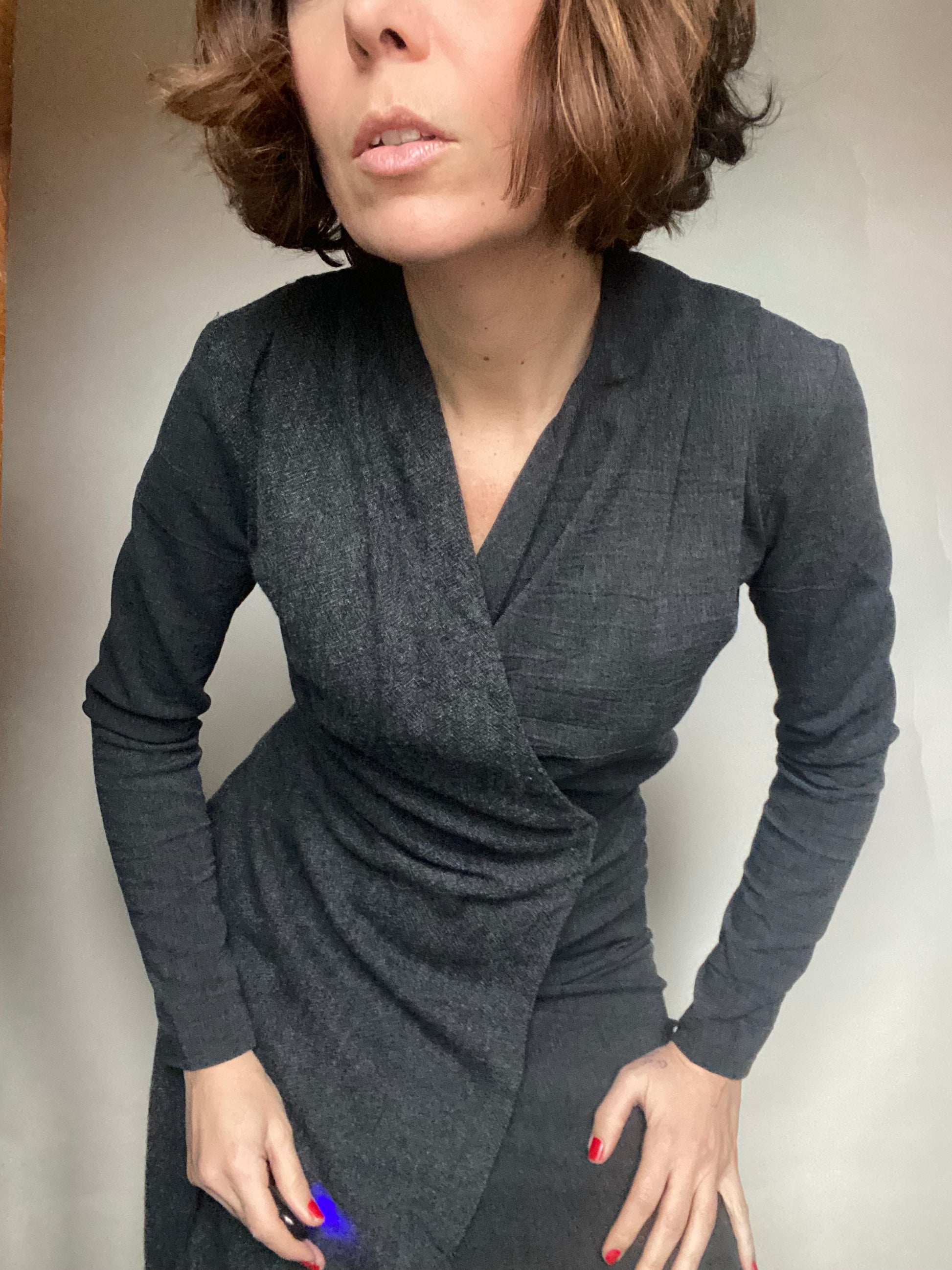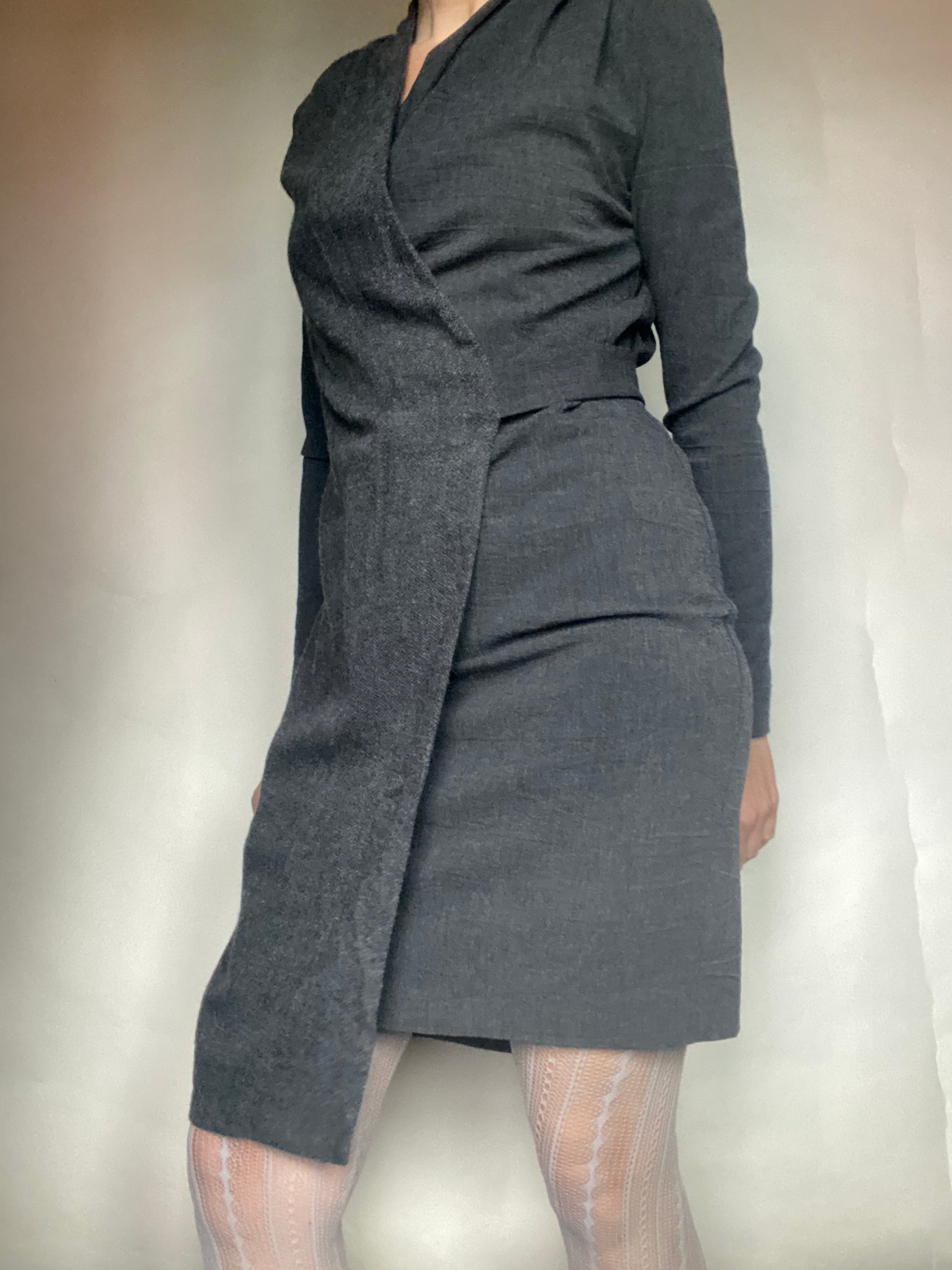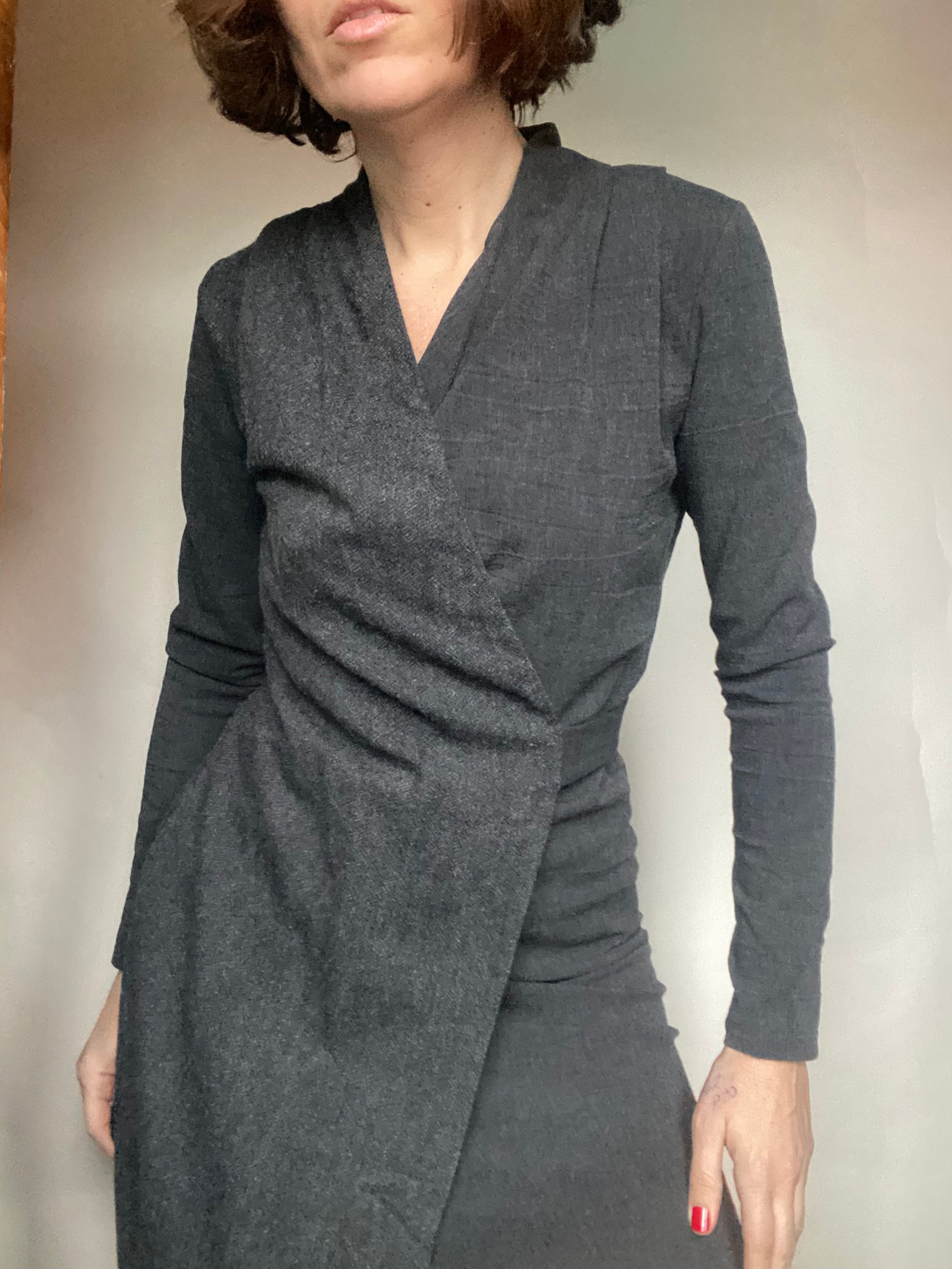 Abito invernale classy con una parte sotto stretch e una parte sopra wrap, cerniera laterale etichette tagliate veste una 40 ita