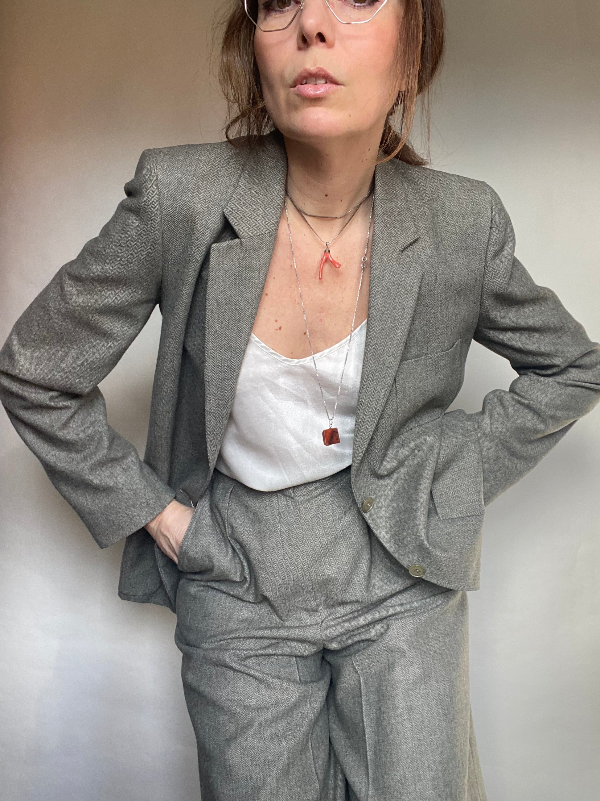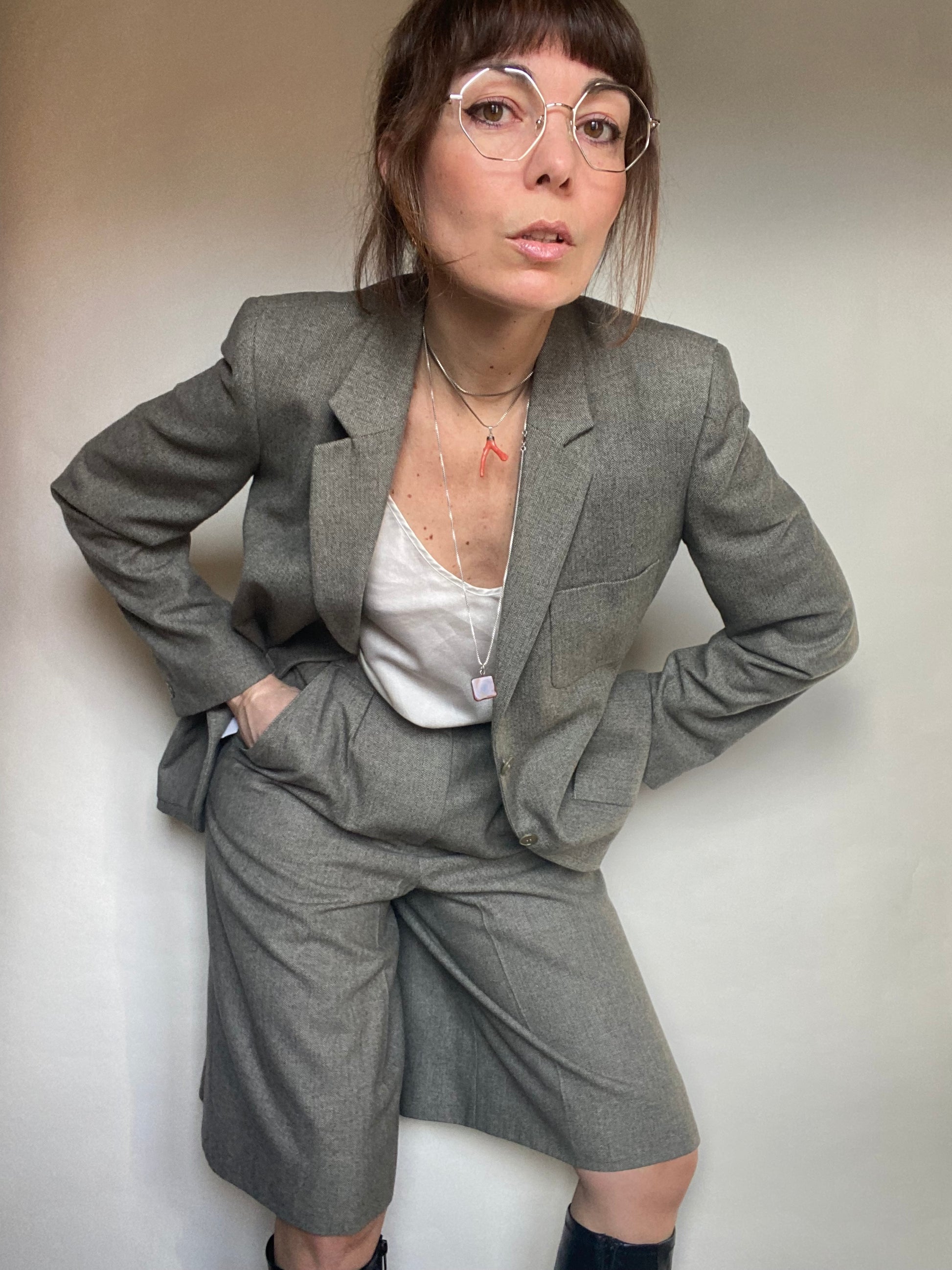 Completo anni 80 cacharel lana e poli, taglia 40 indicata foderato in condizioni ottime a parte un piccolissimo buco di tarma sul fondo del bermuda vedi Foto, composto da una giacca avvitata e un bermuda pantalone vita alta