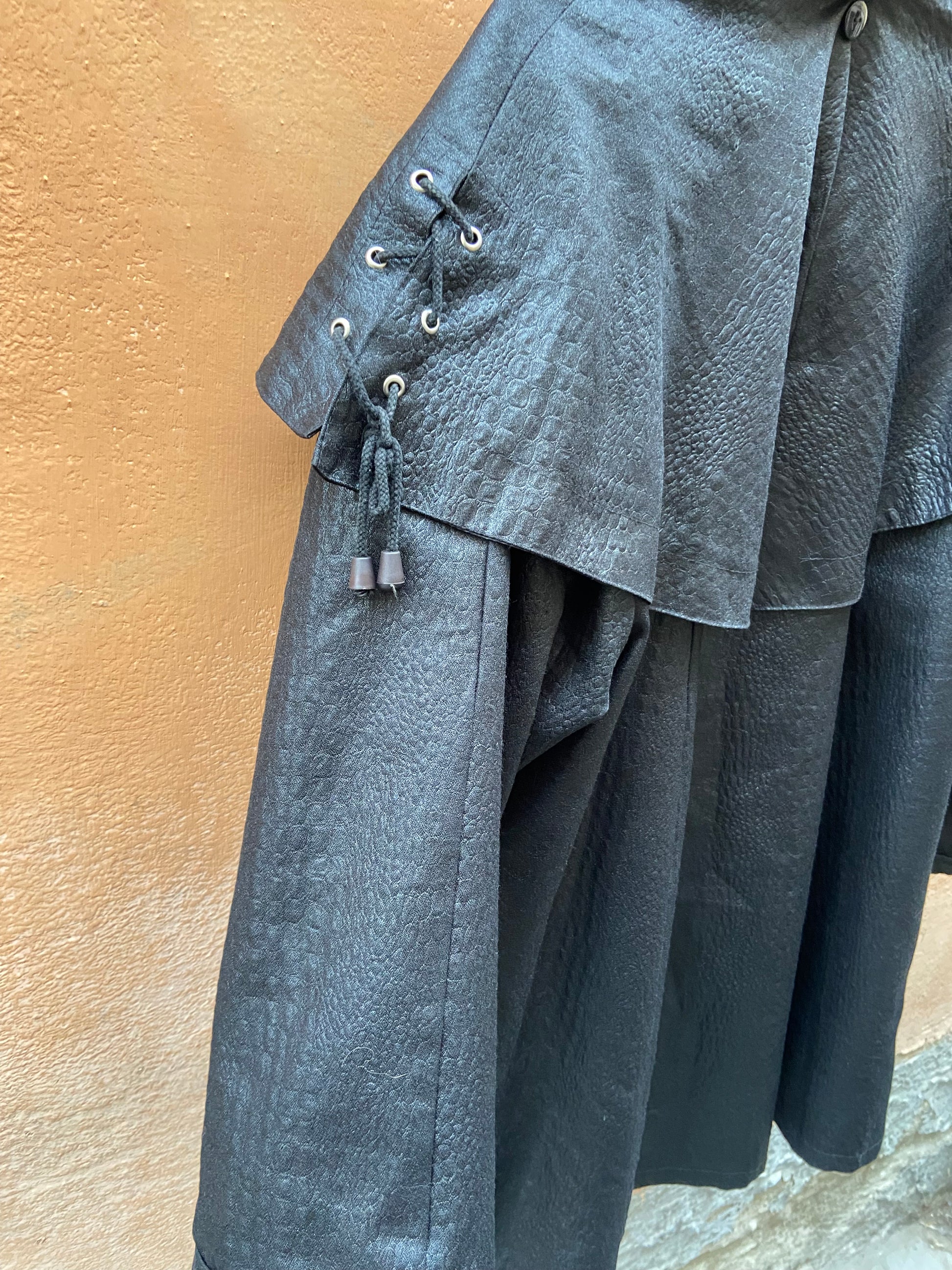 Giacca vintage, impermeabile con mantella, il tessuto stampato tipo serpente e in realtà un poliestere la giacca quindi non è pesantissima va bene per l’autunno il colore è un nero leggermente lucido. Le condizioni sono ottime perfette. Non ci sono taglie indicate veste una ML chiedetemi per le misure esatte Fabbricato in Francia Vintage anni 70.