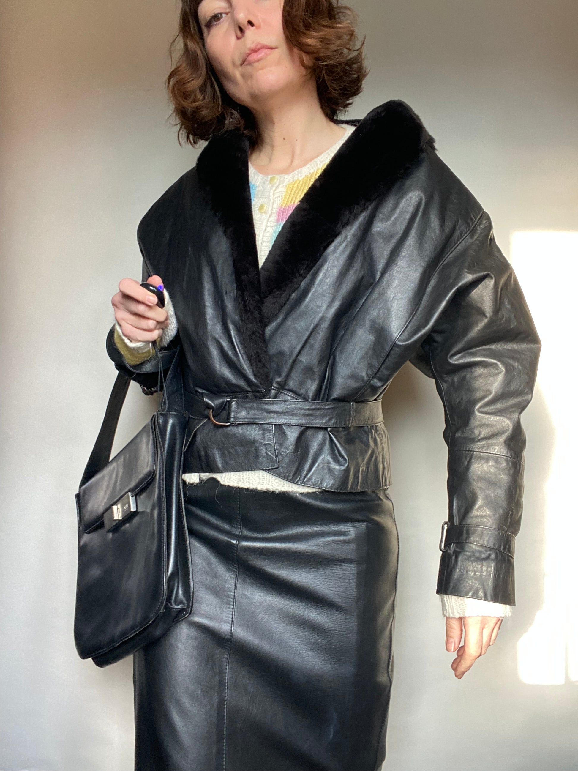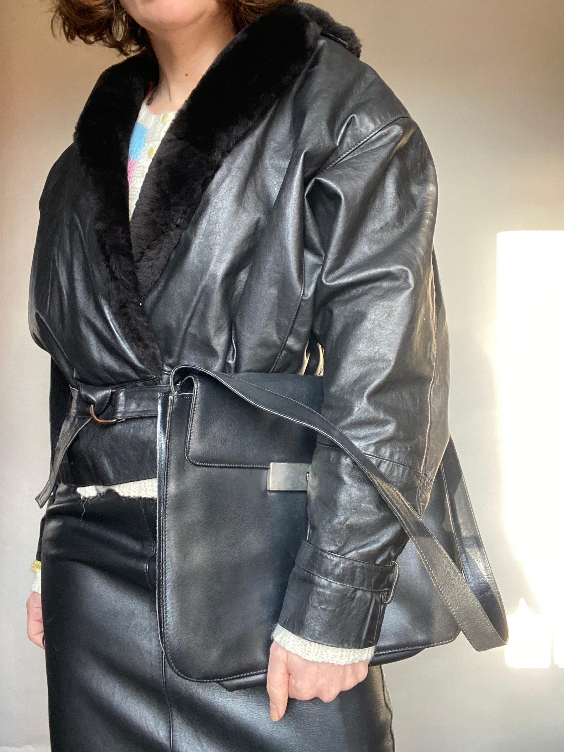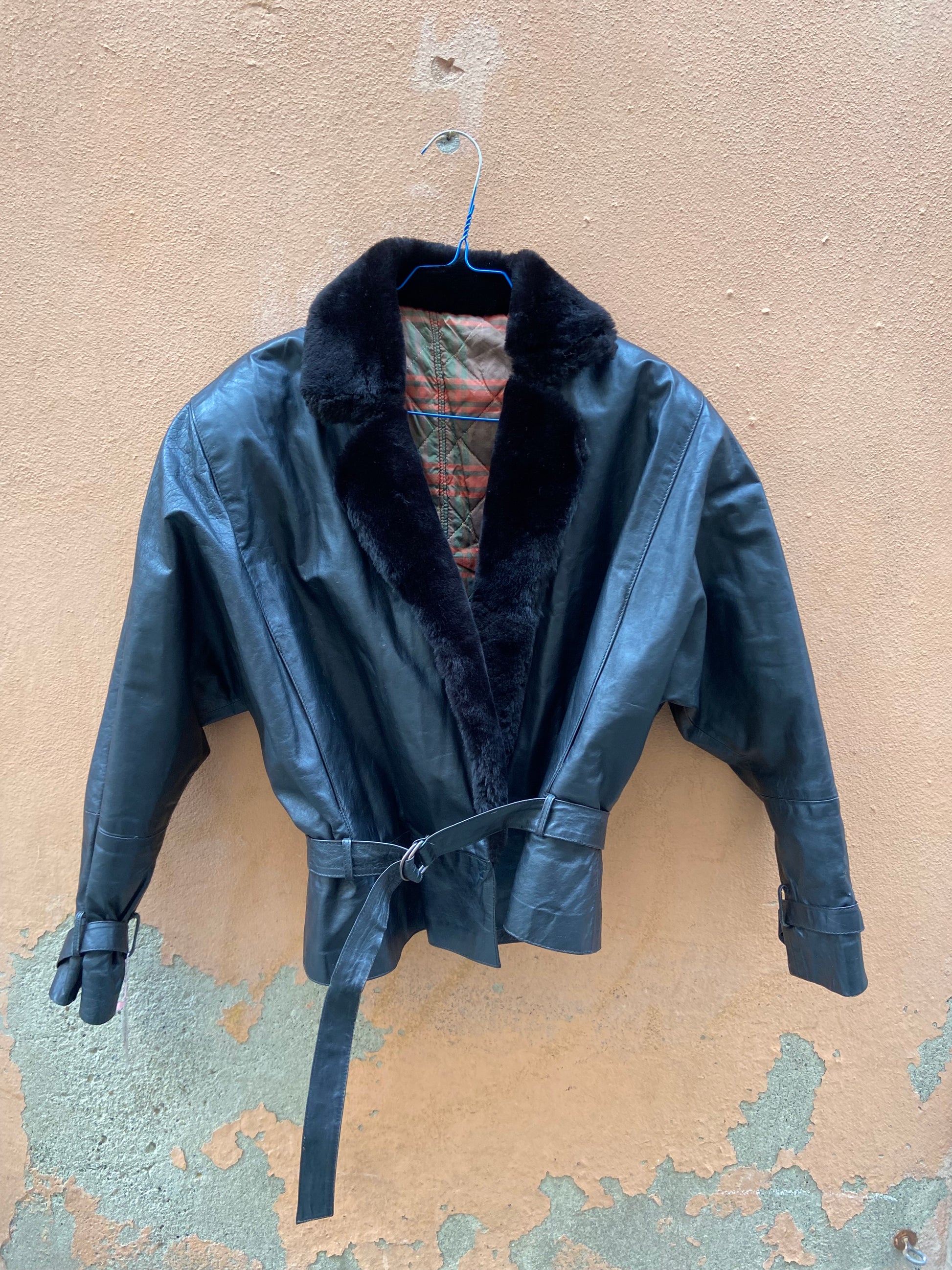 Giacchino dal taglio anni 80 sartoriale con interno Tartan eco pelliccia intorno al collo, non credo sia pelle ma non ci sono etichette la taglia va bene per una 42 non ci sono etichette di composizione d’Italia. Le condizioni sono ottime e si chiude con una cintura davanti con la fibbia.