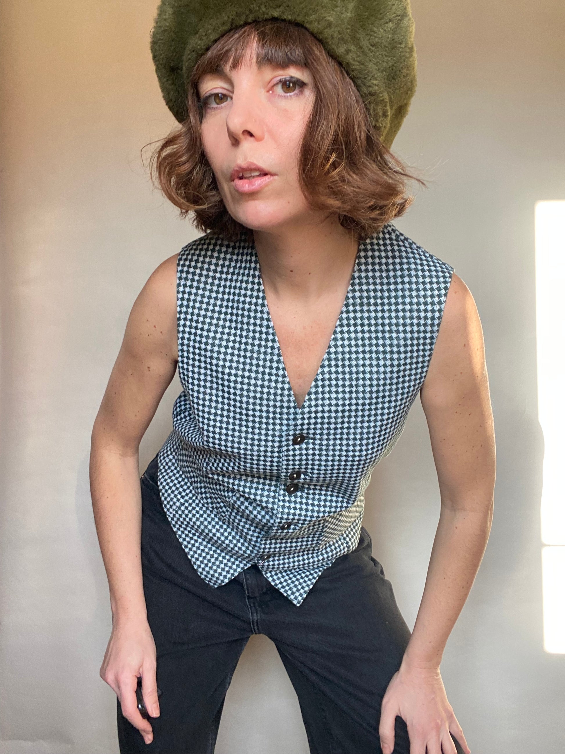 Gilet anni 70 sintetico vichy colore verde veste una taglia 42 non ci sono indicazioni d’Italia e sintetico forse lanetta comunque autunno inverno