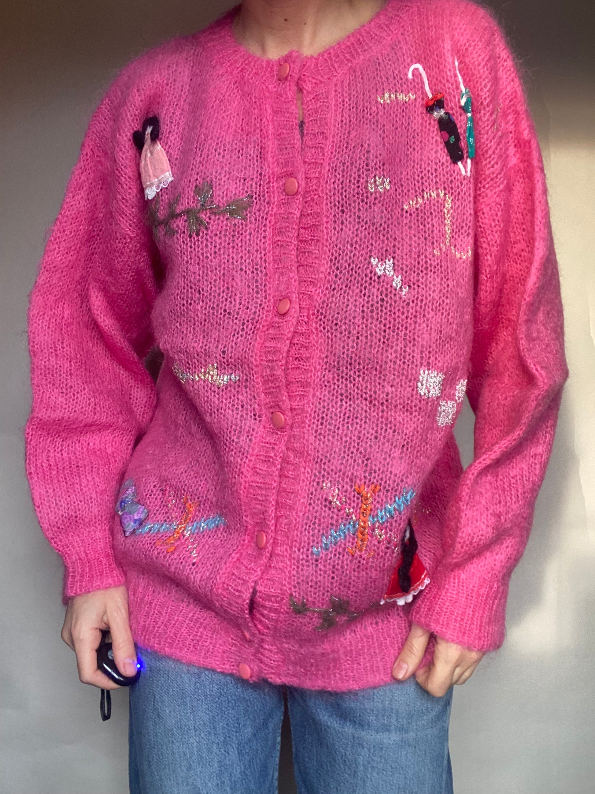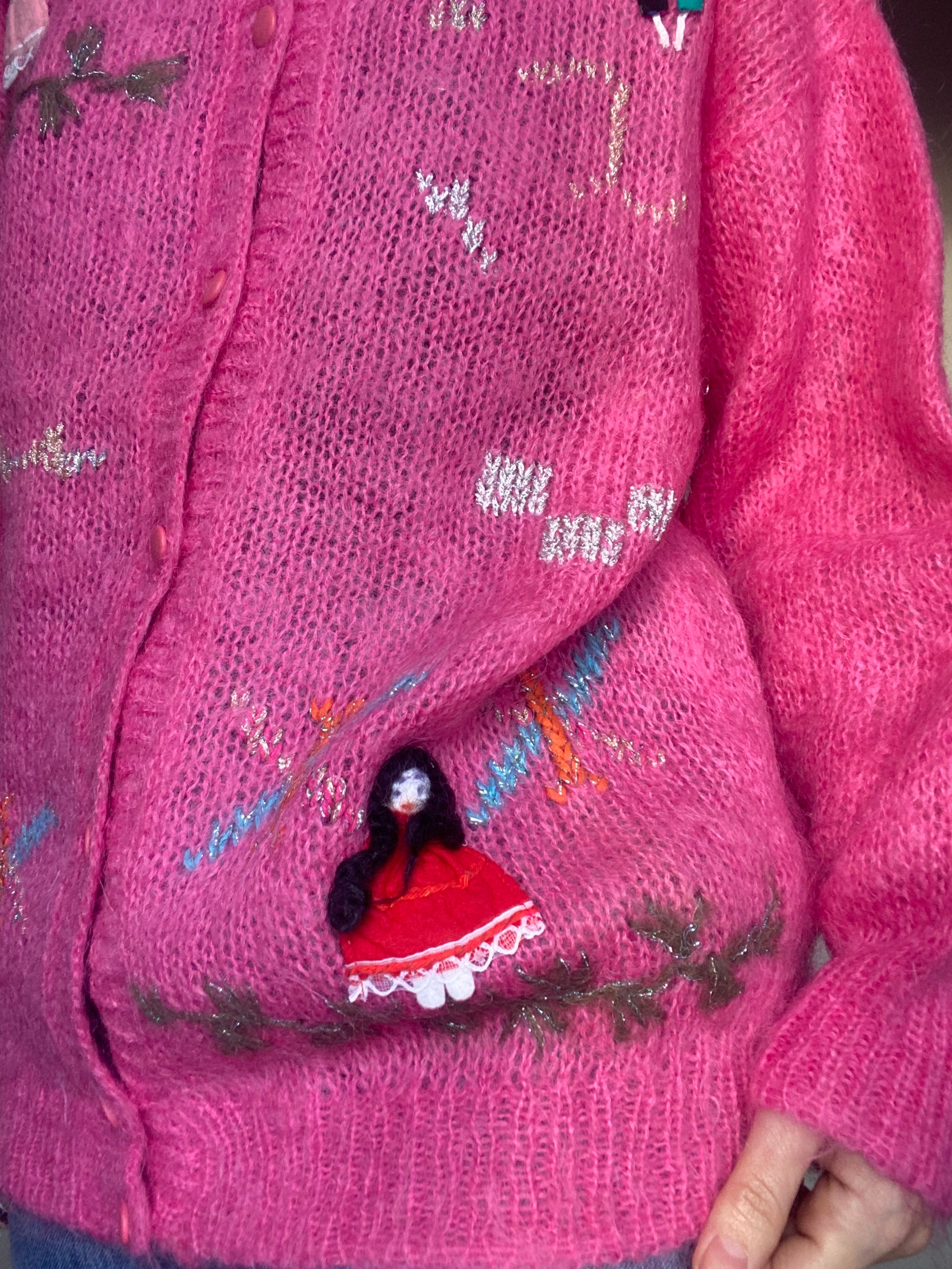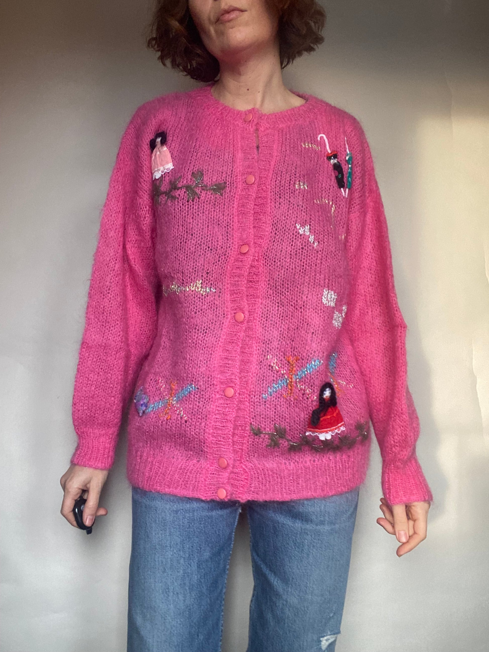 Golfino fatto a mano pure là, ma non ci sono etichette né di composizione né di taglia veste una ML lo vedete su una S alta 165, I bottoni sono tutti apribili le condizioni sono ottime ci sono solamente alcuni imperfezioni nei decori