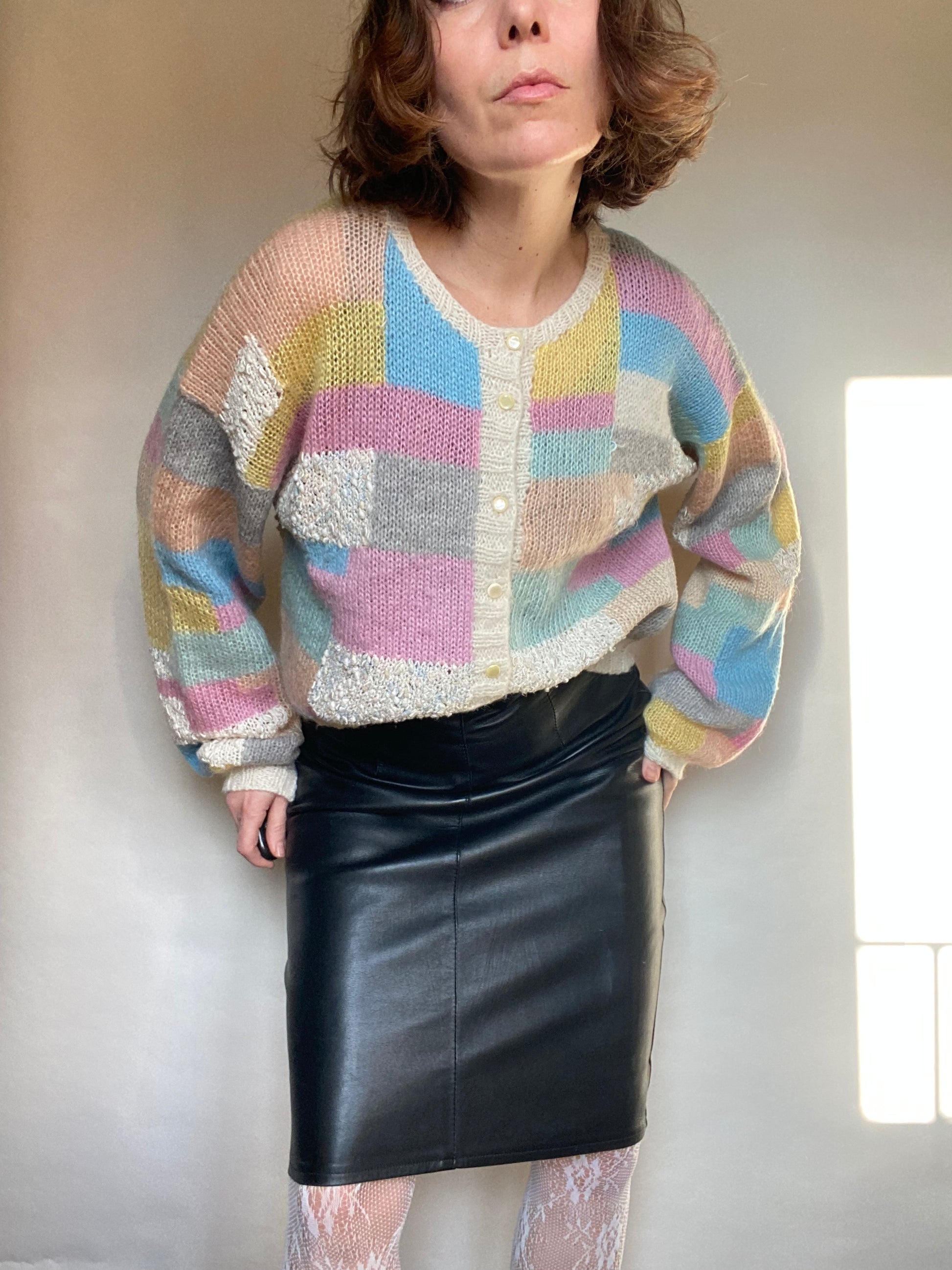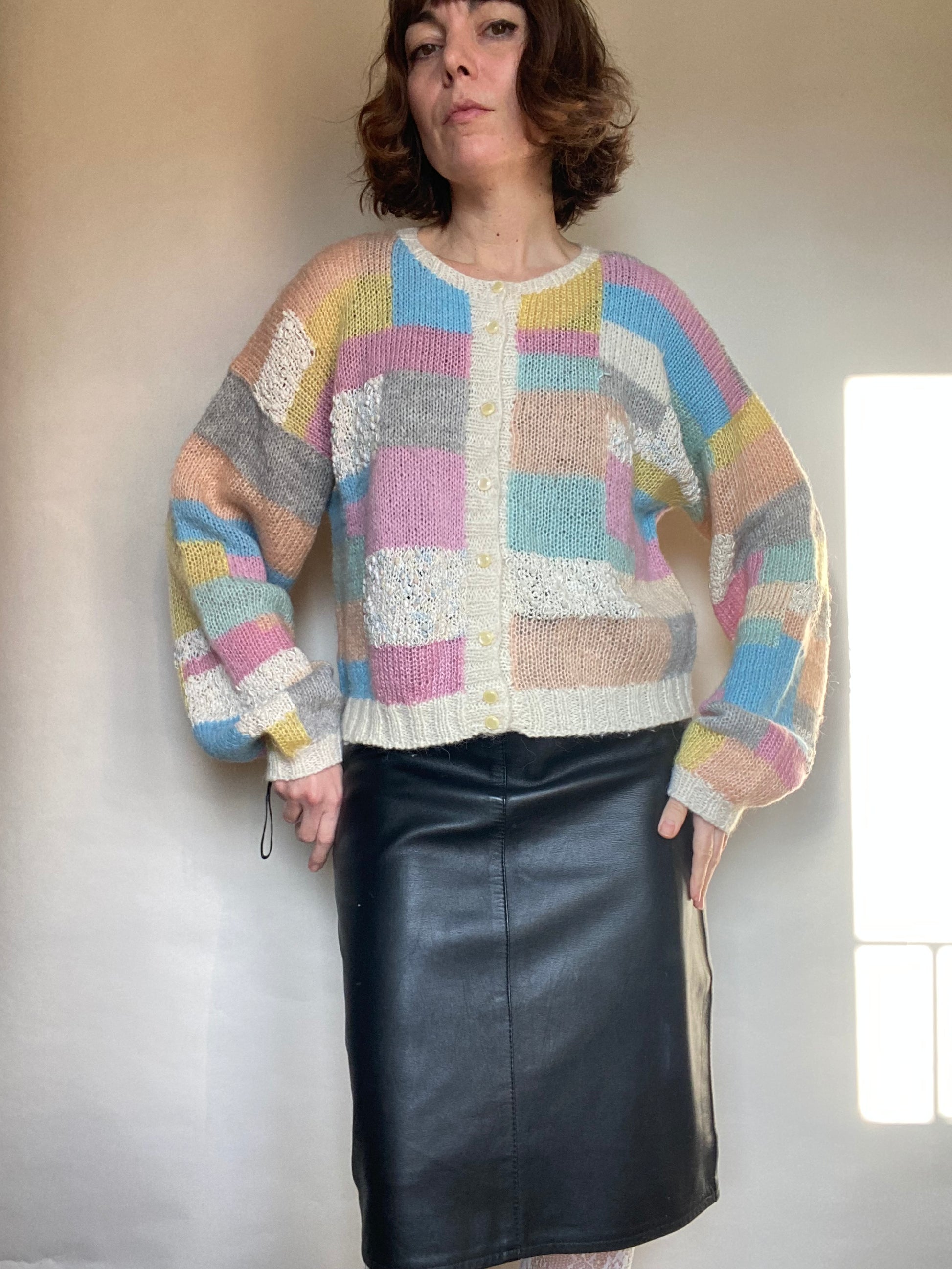 Gomg patchwork lana fatto a mano sartoriale anni 80 con bottoncini taglia unica, lo vedete su una S alta uno e 65 veste dalla S alla L