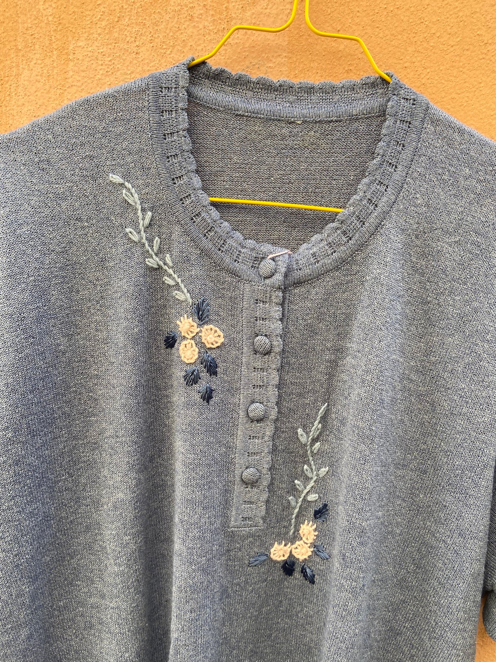 Grey and blue embroidered floral button-up shirt #floral Vintage come nuova senza etichette sintetica tg m/l grey, blue, embroidered, floral, button-up, casual, vintage, chevron knit, relaxed fit, classic style
