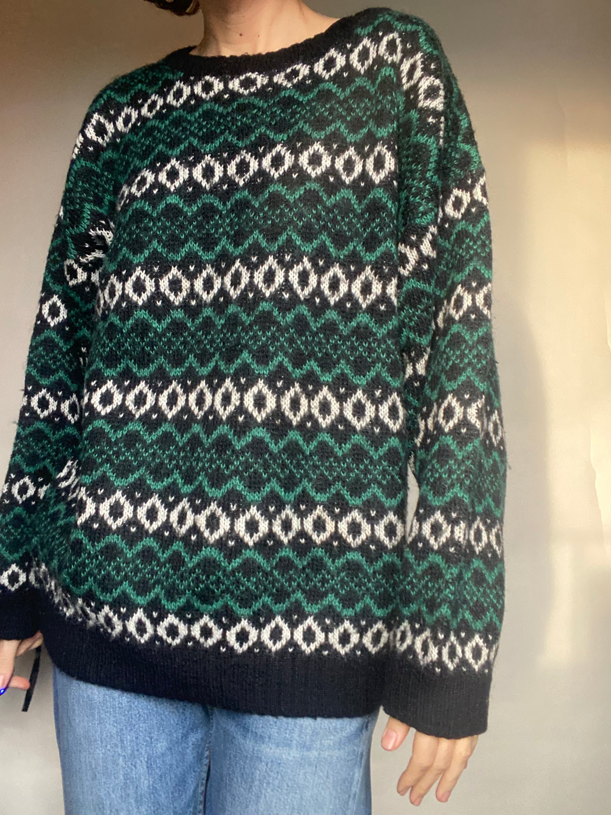 Maglione unisex vintage, jacquard taglia XL, ma consiglio L 50 lana 50, acrilico, buone condizioni verde bianche e nero