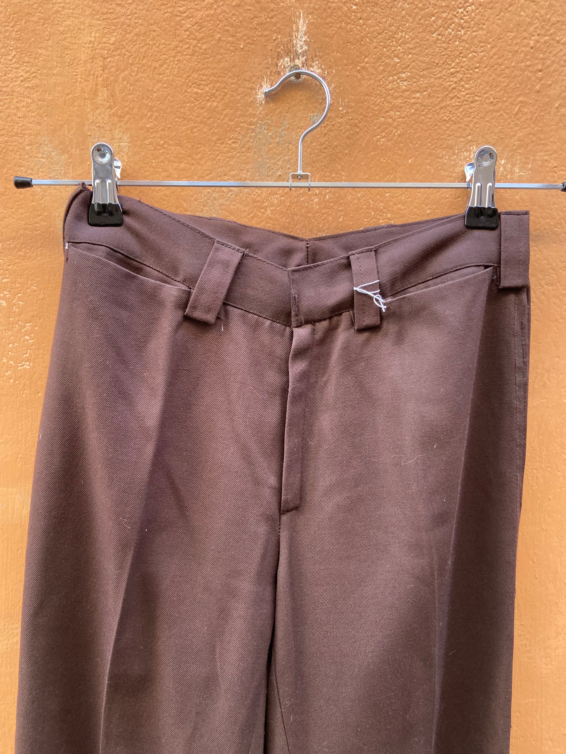 Panta anni 70 in ottime condizioni marrone cioccolato in lana non ci sono però etichette né ritaglia né di composizione non sono foderati sono rifiniti a mano davvero di ottima fattura mi sembra una taglia 40 vita 34 cavalli, 27 coscia 25 fianco 46 lungo 109 Il fondo è al vivo