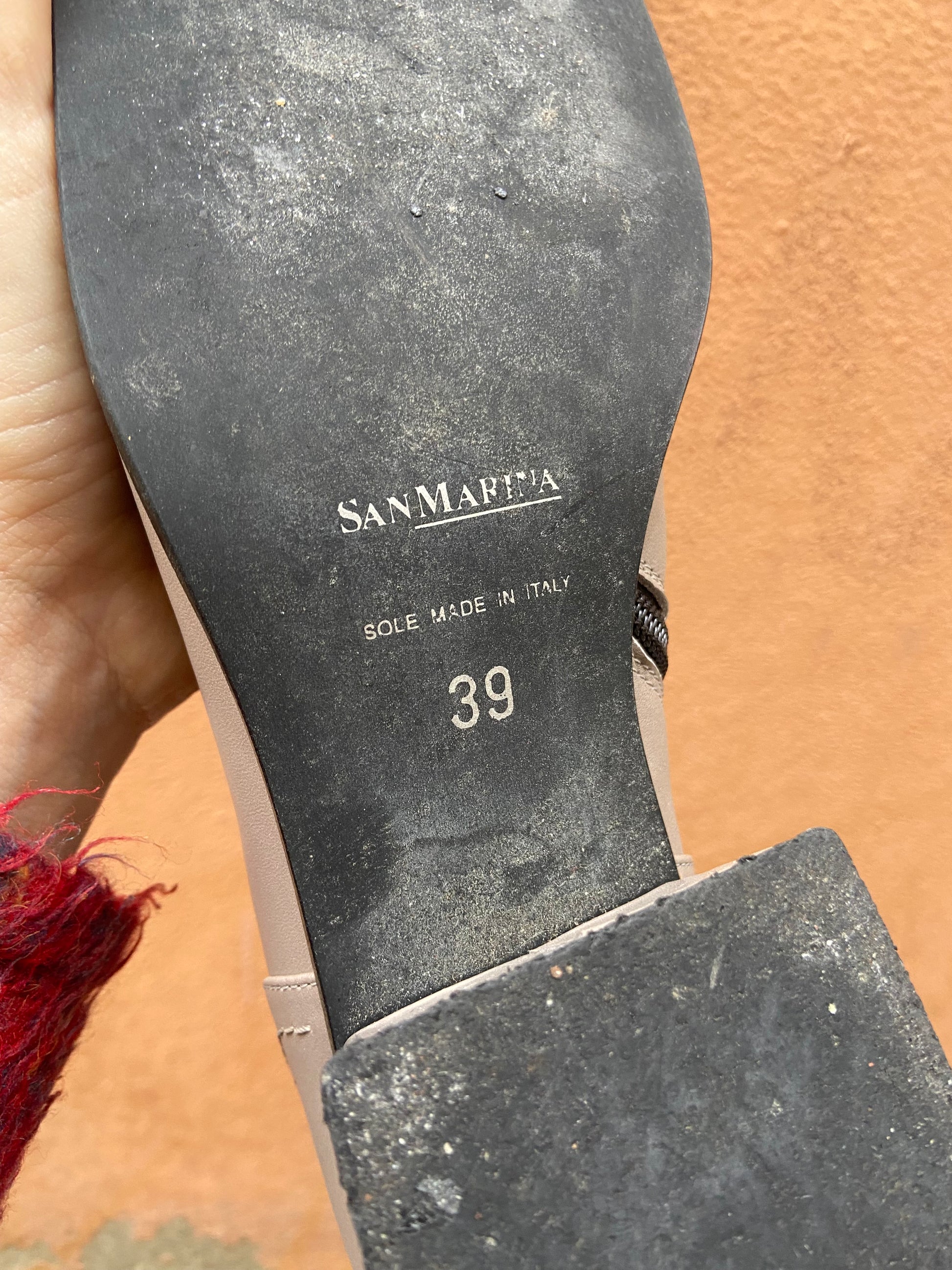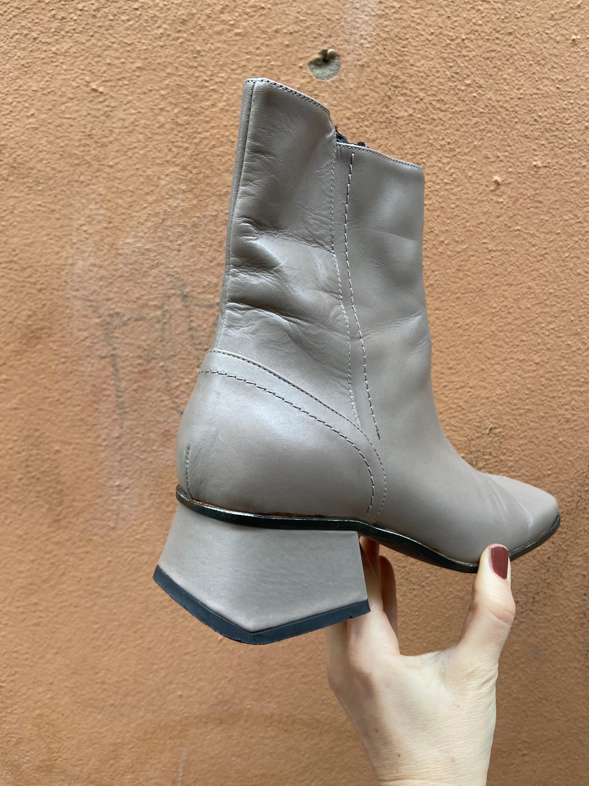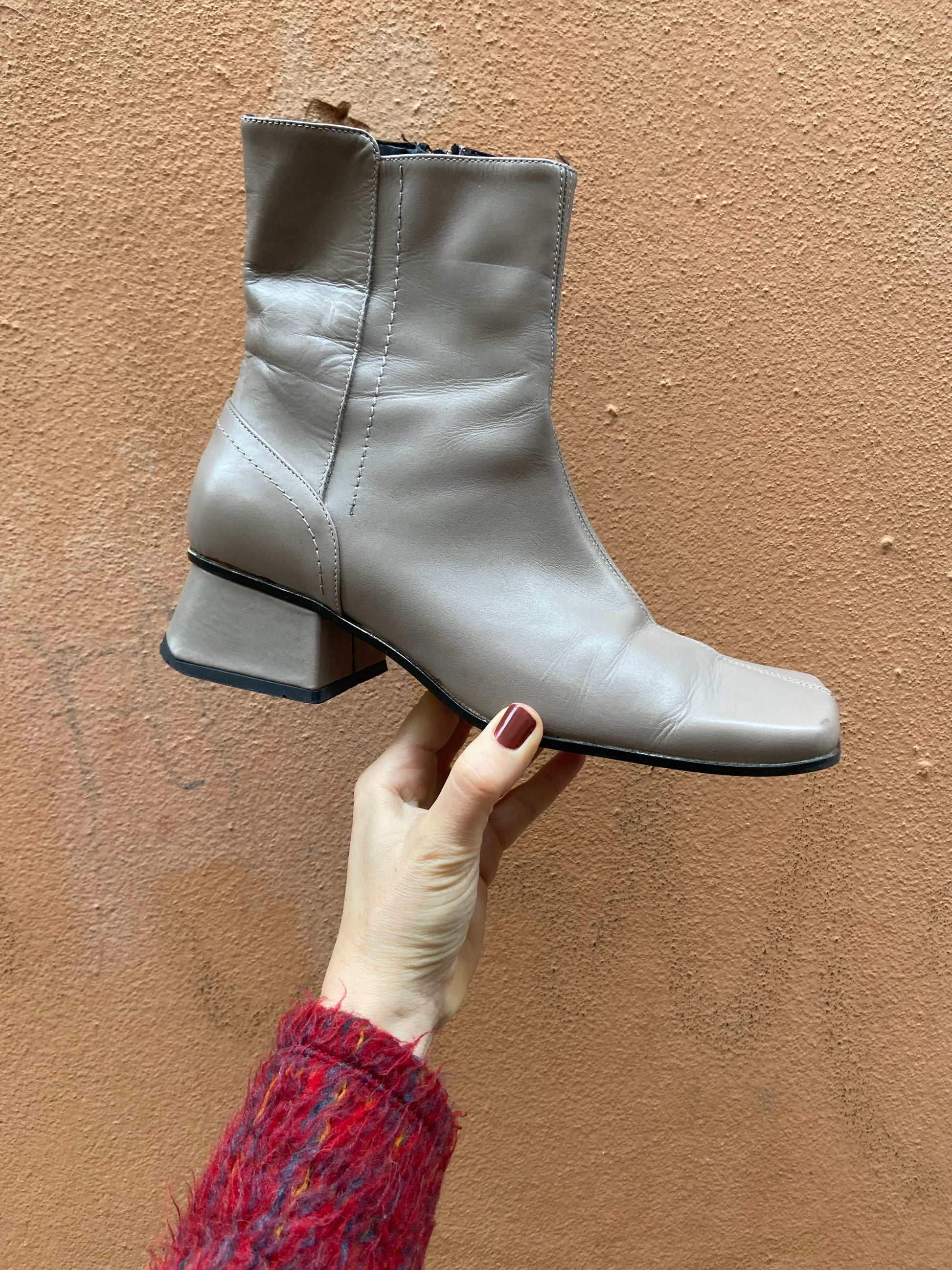 Stivaletto punta quadra con tacco basso in eco pelle grigio tortora, San Marina, marchio francese, made in Italy, condizioni buone numero 39, veste piccolo