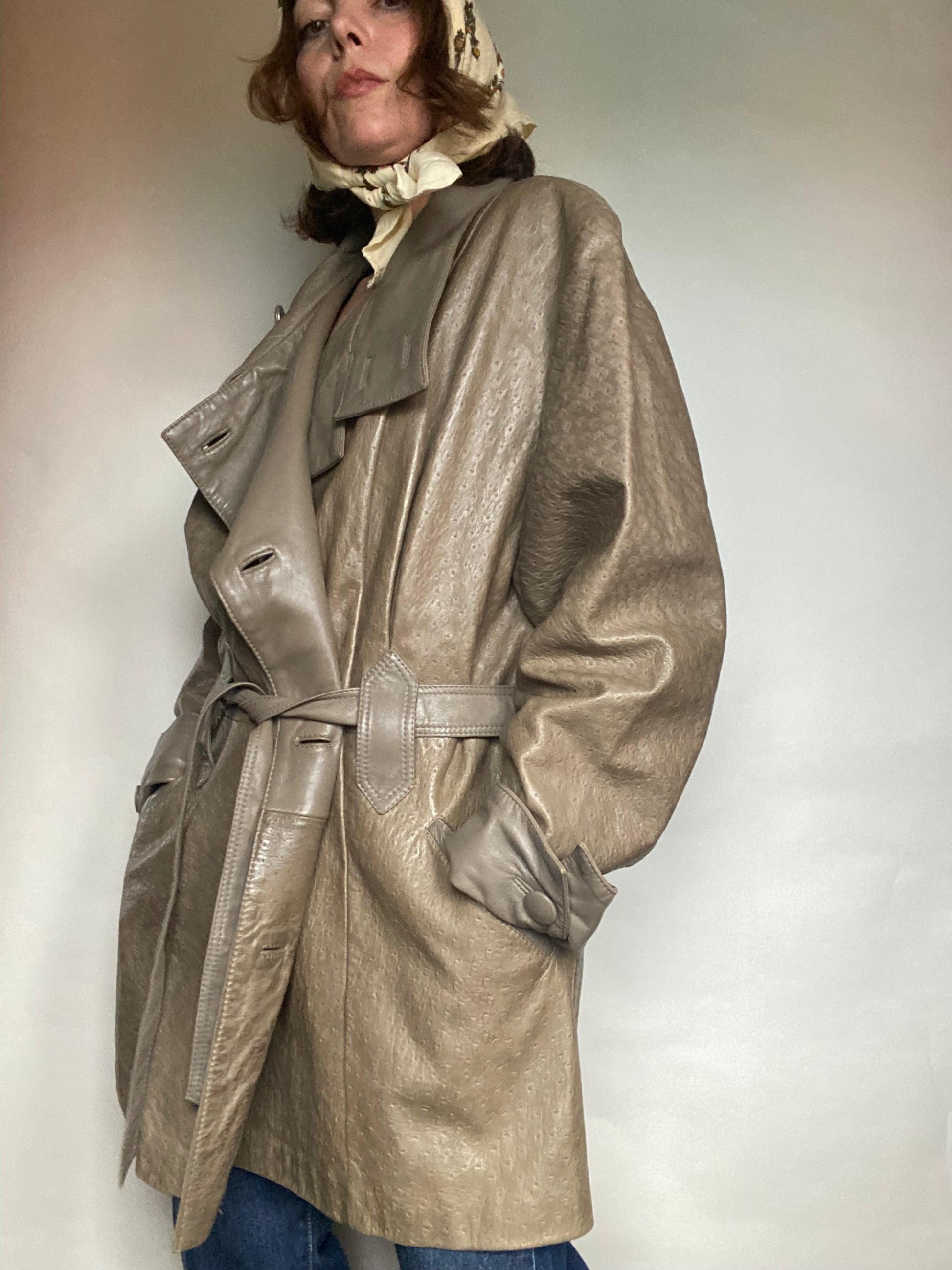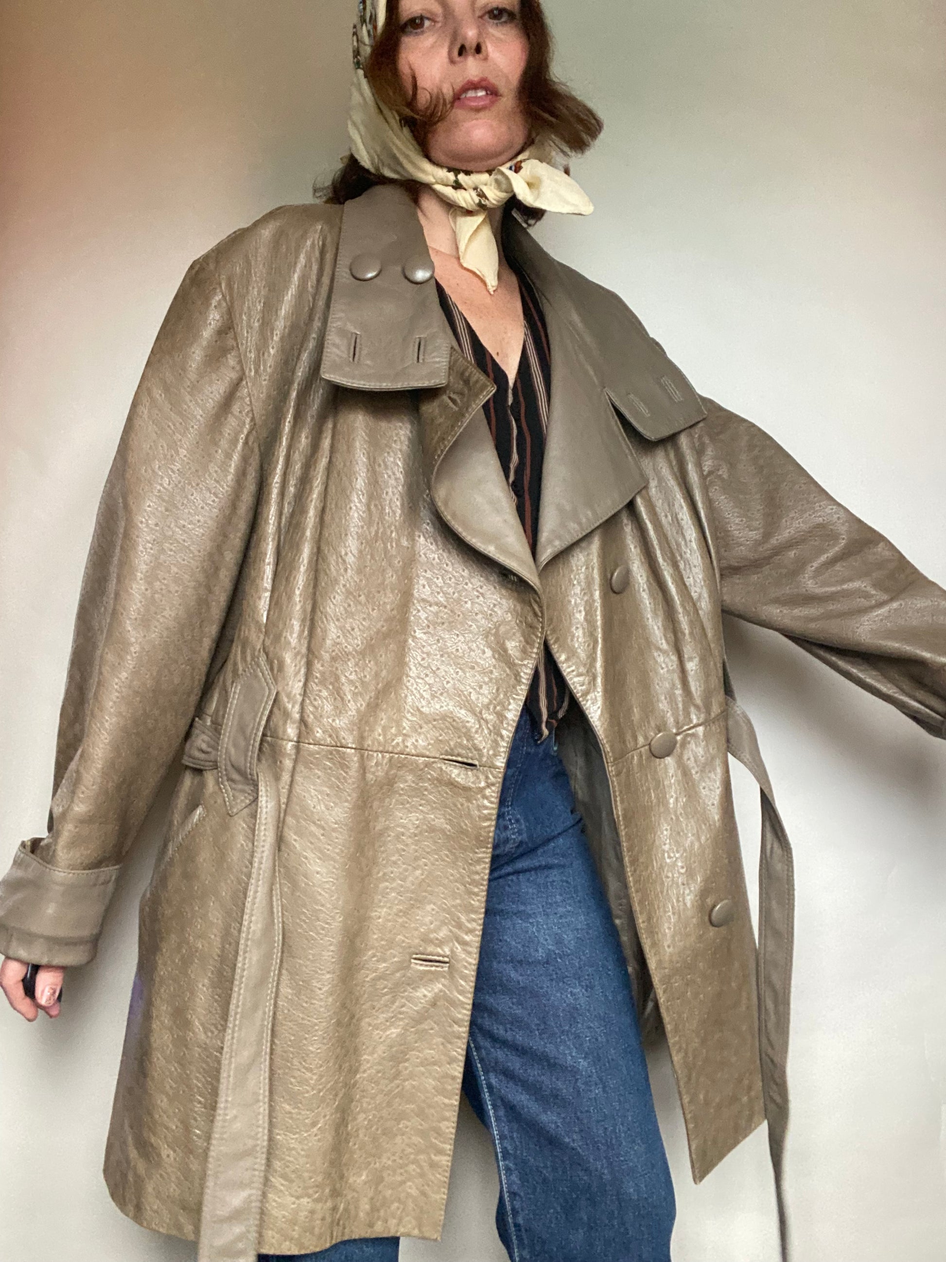 Sublime questo trench in pelle anni 80 veramente morbido in color grigio tortora condizioni ottime foderato con cintura taglia indicata 40 ma credo sia tedesco francese quindi corrisponde una 44 46 italiana lo vedete su una 40 42 italiana alta uno e 65 con un Fit abbastanza over